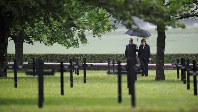 Merkel et Hollande, sous un parapluie à Verdun pour le centenaire de la guerre